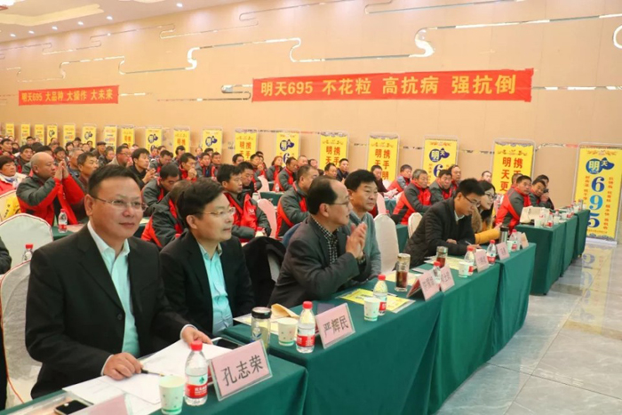鄧科長指出,品種井噴時代,需要大家進行大浪淘沙。選擇好企業、選擇好品牌、選擇好品種至關重要。明天種業是江蘇乃至全國著名的企業, AAA信用企業。選擇明天,攜手明天,企業是可靠的,品牌是可靠的。同時,明天種業主推品種“明天695”參加了2017年國家玉米品種核心展示,表現非常穩定,在穩產性,抗病性、耐高溫等方面表現優異。最后,期望在座的經銷商朋友推廣好“明天695“,努力達到三贏的結果,促進農業生產的發展,讓企業和經銷商發大財,給農民帶來實實在在的利益。